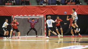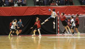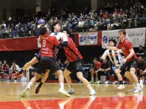 前半スタート直後から走り合いとなった。2分、治田の7メートルスローで1点目。7分には橋本が数的優位を生かし逆転のエンプティゴールを決めた。しかし中盤から徐々に相手ペースとなり、6点ビハインドで折り返した。