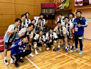 後半は一転して相手に主導権を握られ、再三同点に迫られた。両チームに退場者が相次ぐ荒れた展開の中、シュート体制に入った庄子が相手に接触され負傷退場する場面もあった。しかし終盤、パスカットから所の速攻、田中のスカイプレー、最後は中田の速攻が決まり、1点差で逃げ切った。